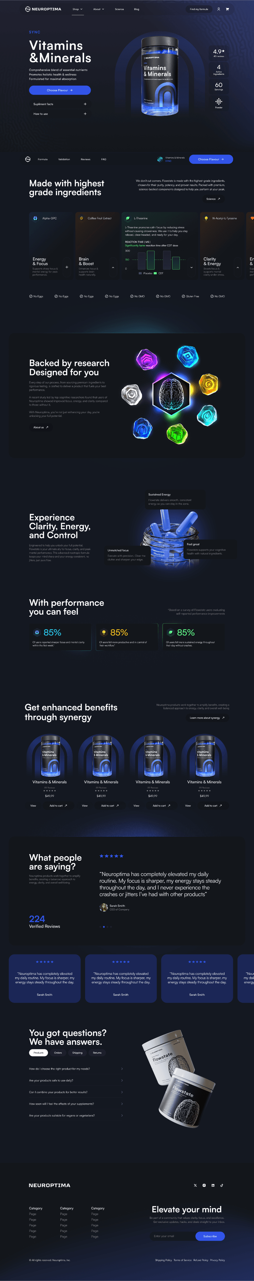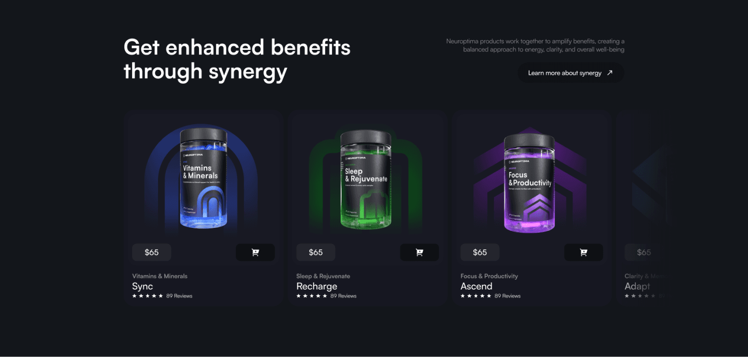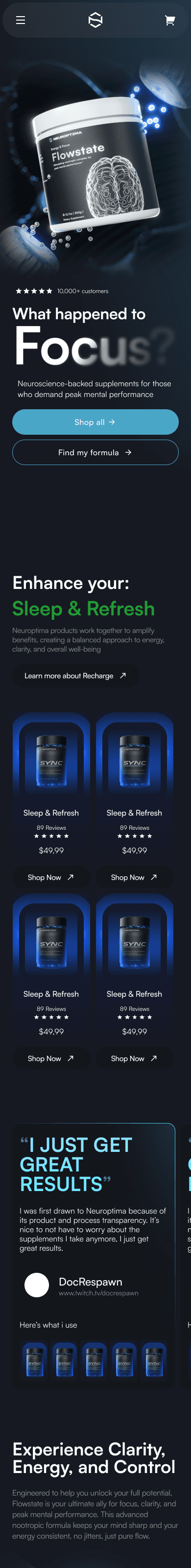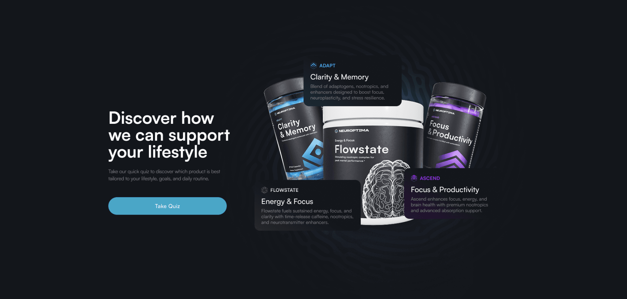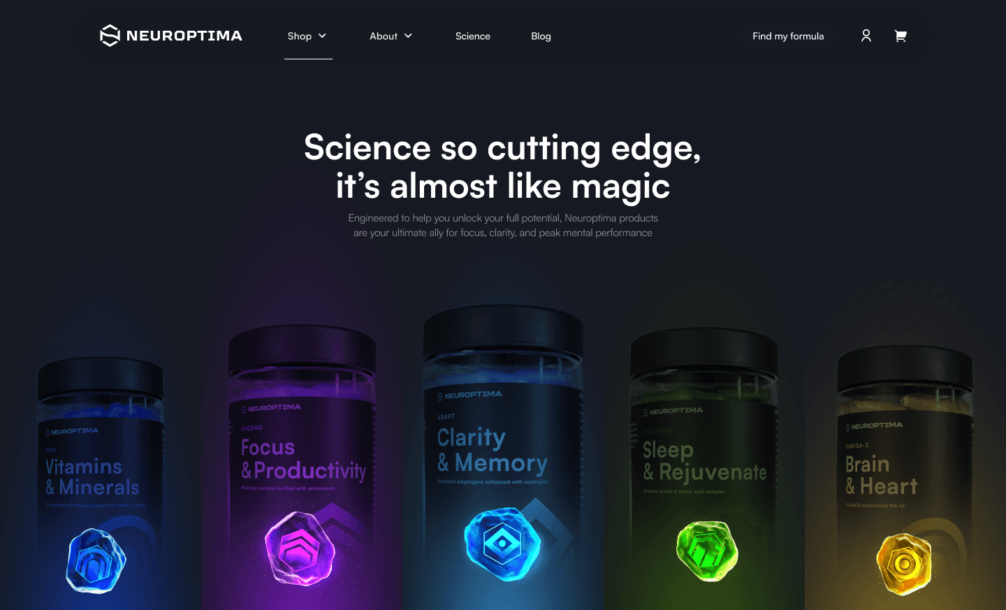 Redesigned Neuroptima’s Shopify store with a benefit-driven IA, responsive UI, lazy-loading assets, and streamlined checkout (including bundle builder and one-click pay options) to boost conversion and AOV.