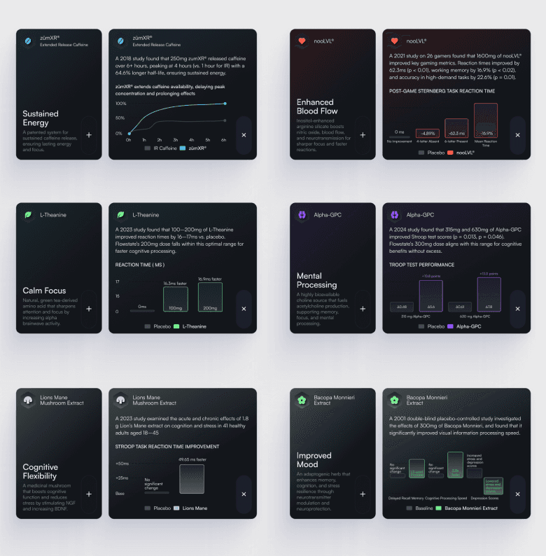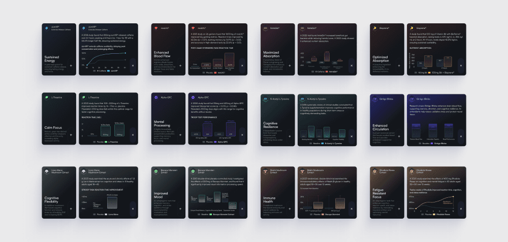Multiple product lines (focus, sleep, hydration, recovery) with different usage instructions and ingredient call-outs. Customers struggled to understand benefits from a glance.